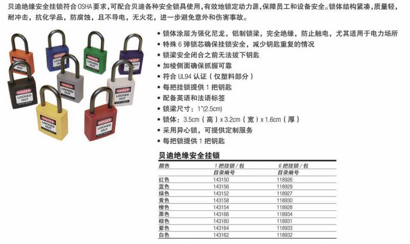 功能最強(qiáng)的上鎖鎖具:貝迪安全掛鎖符合所有OSHA要求,可用于安全替代上鎖過程里使用的金屬鎖具。鎖體絕緣,獨(dú)特的鎖心可防止電流從鎖梁傳至鑰匙,從而進(jìn)一步提高了觸電防護(hù)性能。貝迪安全掛鎖還具有一定的防腐蝕性能。第三方檢測證明貝迪產(chǎn)品在重復(fù)鹽水噴霧試驗(yàn)條件下的性能卓越。
